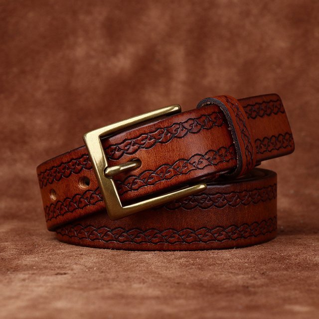 Crafted from high-quality cowhide leather, this belt is built to last. The sturdy 2.8 cm width offers both strength and style, making it a reliable choice for your favorite jeans or trousers. Featuring a beautiful embossed pattern and a classic copper buckle, this belt not only secures your outfit but also adds a touch of vintage luxury. It’s a piece that will never go out of style and will only improve with age.