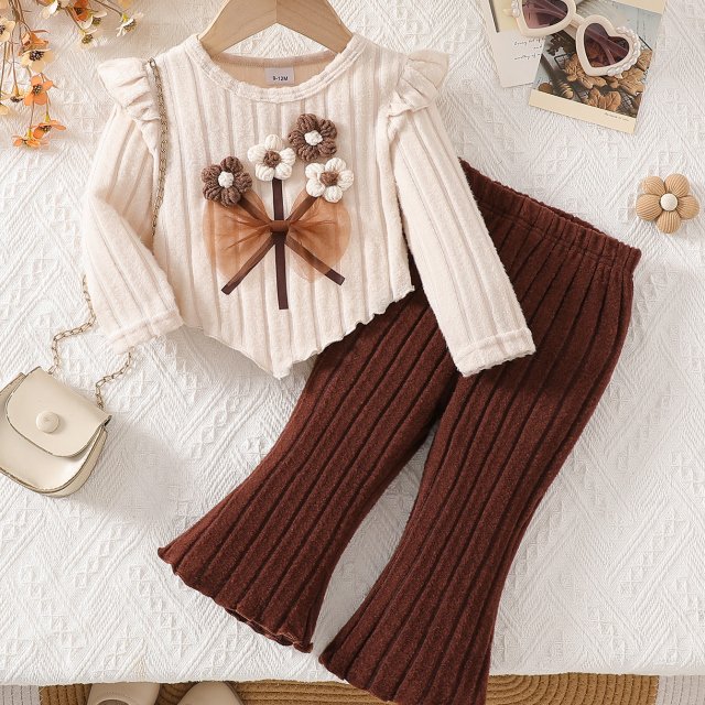 Baby Girl Autumn Floral Bow Top and Brown Bell Bottom Pants Outfit Set