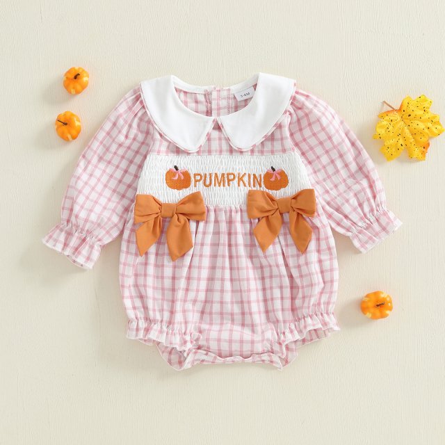 Baby Girl Halloween Romper Plaid Pumpkin Embroidered Jumpsuit with Bow