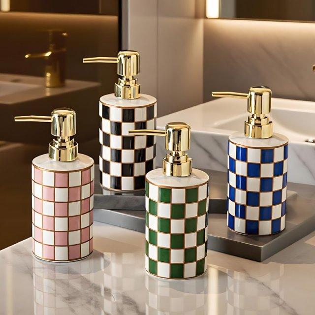 Checkerboard Ceramic Bathroom Dispenser Set – Lotion, Soap & Toothbrush Holder