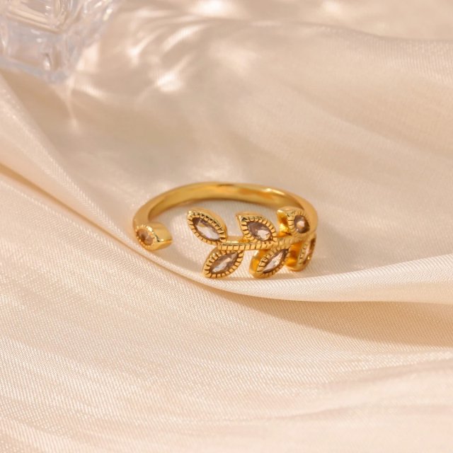 Crystal Geometric Vintage Leaf Ring – 18K Gold Plated Zircon Jewelry for Women