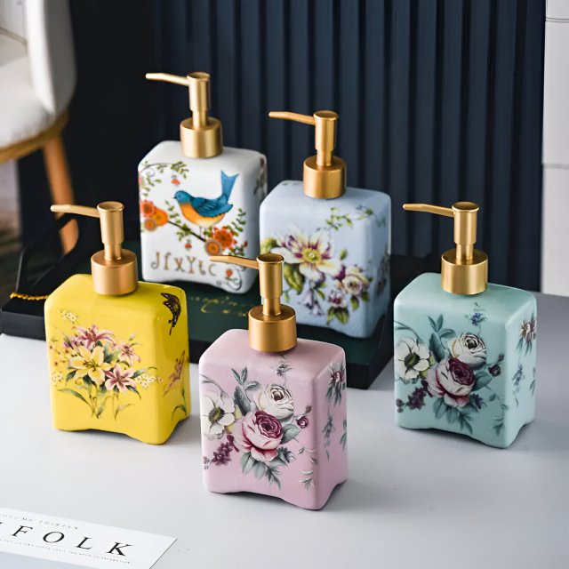 Designed for those who appreciate fine craftsmanship and refined décor, this ceramic bottle brings a touch of tranquility to your bathroom or spa setting. Whether used during your morning routine or an evening bath, it enhances the atmosphere with its soft colors and nature-inspired artistry. The smooth ceramic material keeps your liquids fresh and hygienic while the pump dispenses effortlessly with each press.