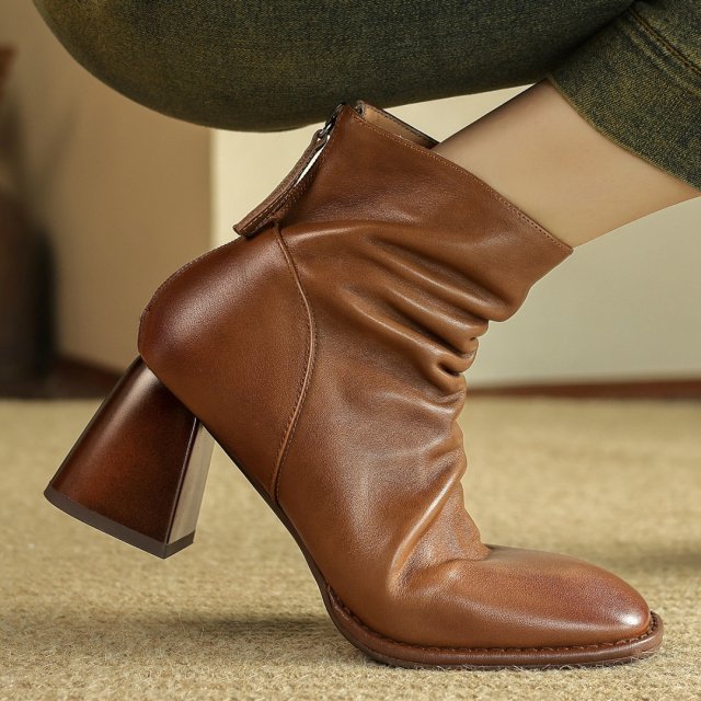 Elegant Leather Square Toe Ankle Boots for Women – 6.5cm Heel, Back Zip