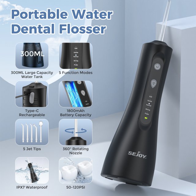 This water flosser comes with 5 interchangeable nozzles and 5 adjustable modes to suit every need — from gentle gum massage to high-pressure deep cleaning. Its 10 oz (300 ml) detachable water tank ensures long, uninterrupted use, while the 360° rotatable jet tips allow you to easily reach every corner of your mouth. The USB rechargeable 1800mAh battery delivers up to 30 days of power on a single charge, making it perfect for both home use and travel. Plus, with IPX7 waterproof protection, it’s safe to use even in the shower.